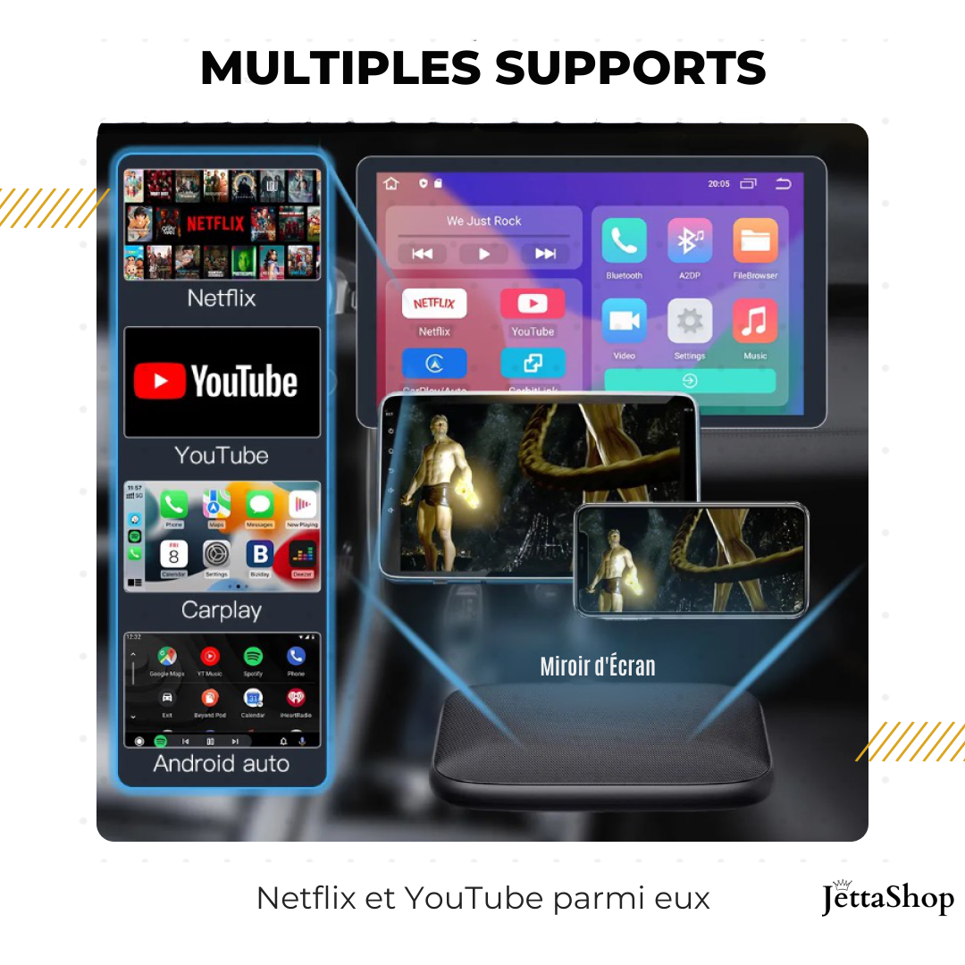 Le DriveJetta Pro™ élimine non seulement les câbles, mais offre également une expérience d'intégration complète ! Compatible avec Apple CarPlay et Android Auto, il vous permet d'accéder à vos applications préférées, comme Netflix et Youtube, directement sur l'écran de votre voiture. Profitez également de la praticité des assistants vocaux natifs de votre téléphone portable !
