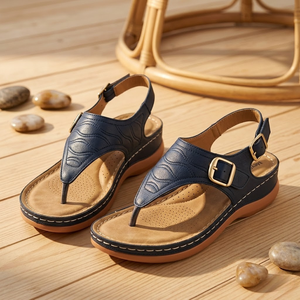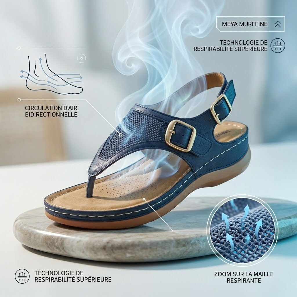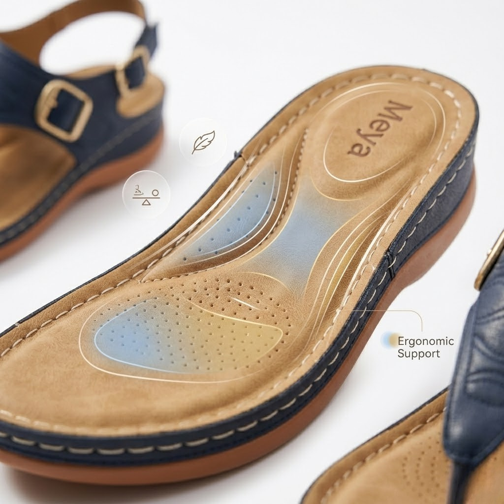 Ne faites plus de compromis entre style et santé. Les sandales Meya intègrent une semelle intérieure préformée qui soutient activement la voûte plantaire et réaligne votre posture naturelle. En répartissant uniformément la pression sur l'ensemble du pied, elles aident à prévenir les douleurs articulaires et la fatigue, vous permettant de rester active toute la journée avec une sensation de légèreté constante.